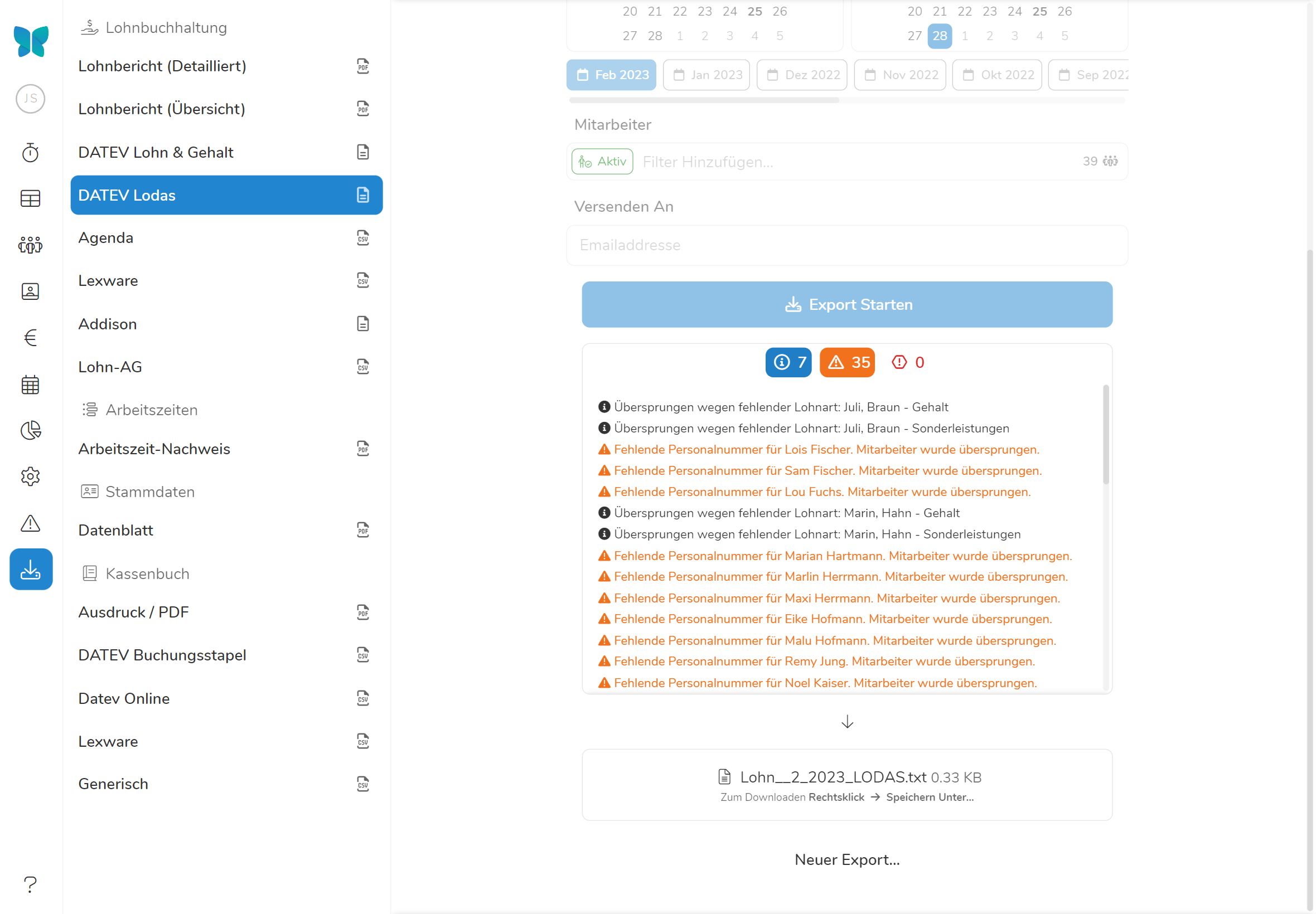 Export in Buchhaltungsprogramme: Neben den Berichten in PDF-Form können Sie lohnabrechnungsrelevante Bewegungsdaten auch in verschiedene Lohnbuchhaltungsprogramme exportieren. Aktuell unterstützte Formate sind: