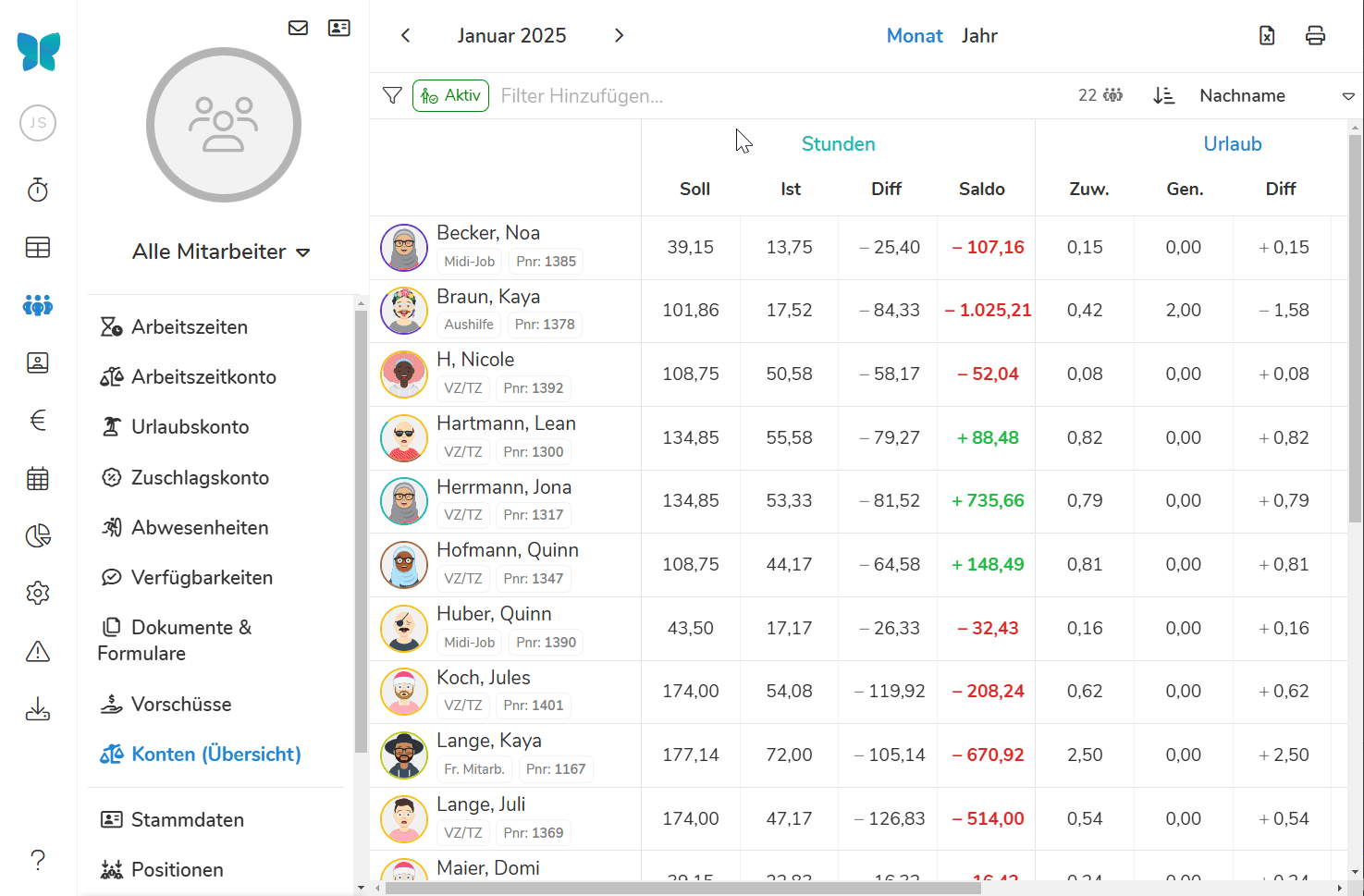 Die Inhalte der Exporte des Arbeitszeit-, Urlaubs- und Zuschlagskontos gleichen den unter dem Reiter Mitarbeiter dargestellten Konten.