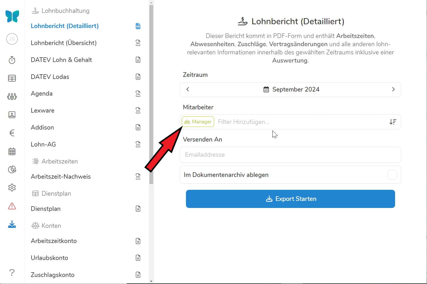 Im Mitarbeiterfilter können wir auswählen für welche Mitarbeitergruppen wir einen Export erstellen wollen. Dazu können wir über die Filterleiste die gewünschten Mitarbeiter über Abteilungen, Anstellungsverhältnisse oder einzeln auswählen. Dabei ist zu beachten, dass Filteroptionen sich untereinander weiter beschränken.