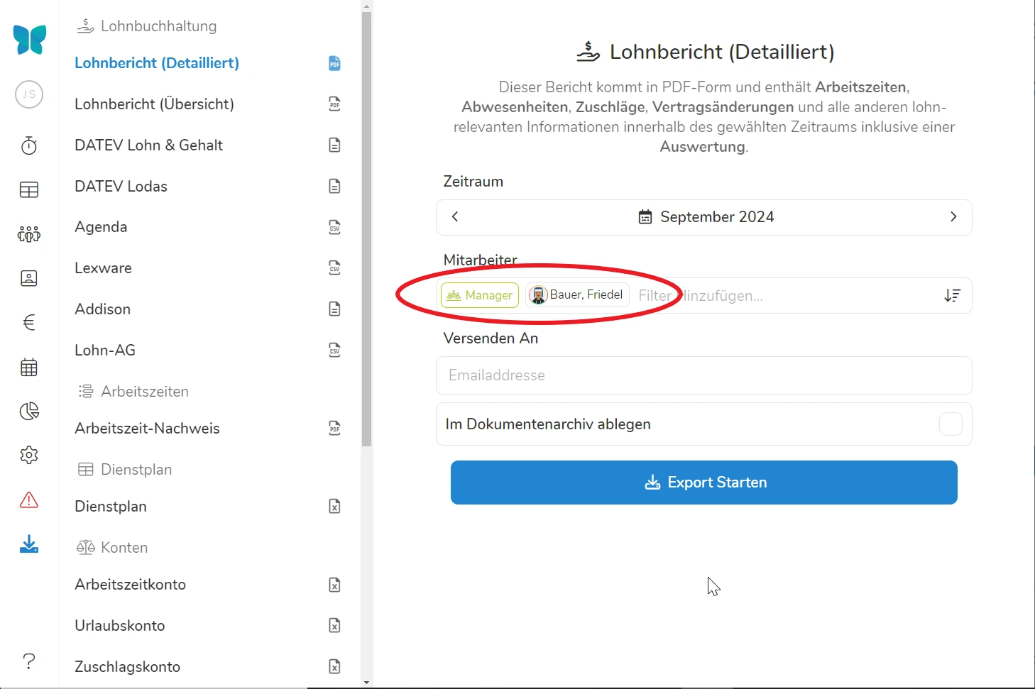 Tipp: Durch die Auswahl einer Abteilung und eines spezifischen Mitarbeiters werden nur die Arbeitszeiten und Lohndaten exportiert, die dieser Mitarbeiter innerhalb der gewählten Abteilung besitzt.