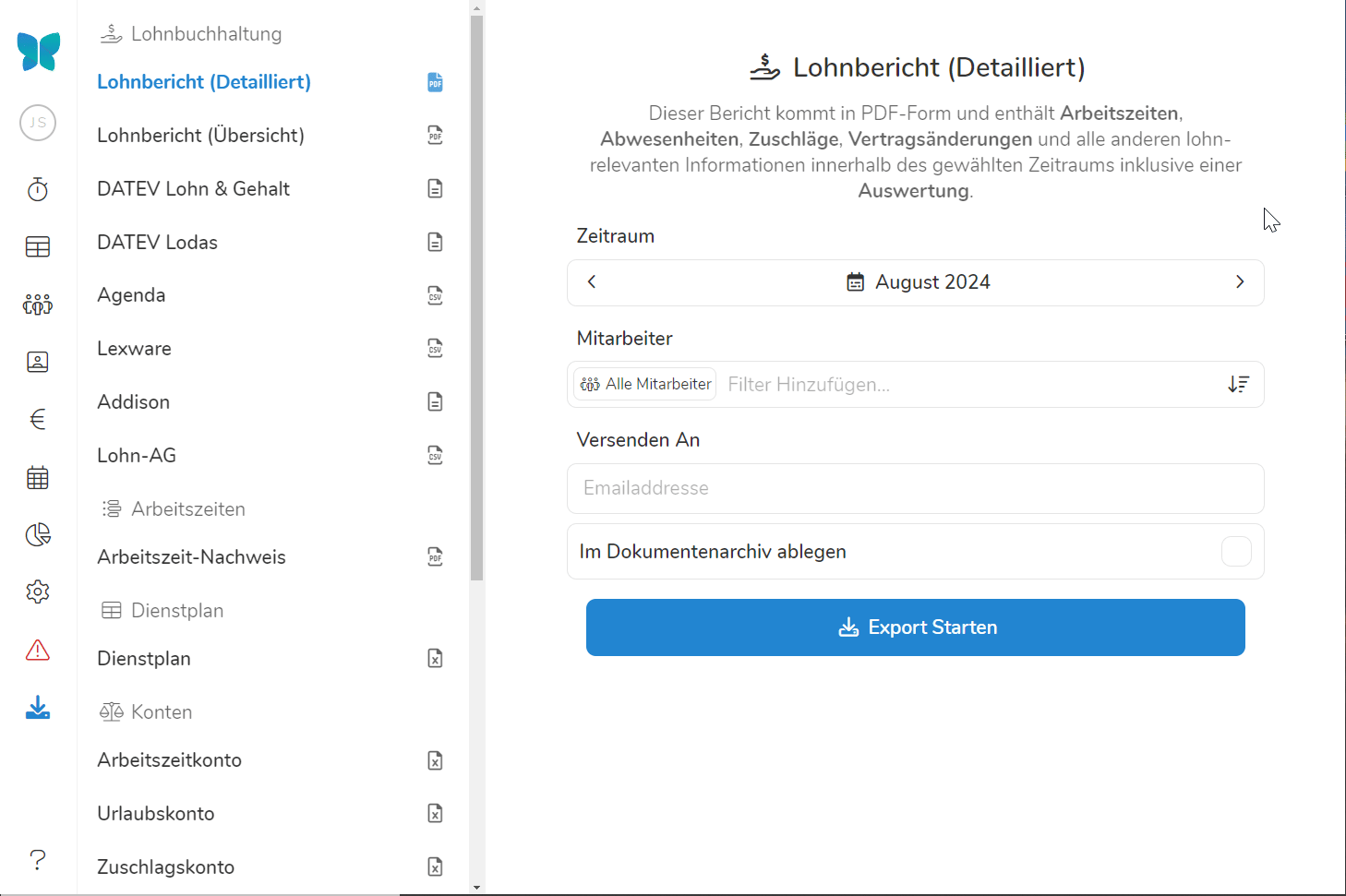 Hier finden Sie alle Exportoptionen, die der Lohnvorbereitung und -dokumentation dienen. Die verschiedenen Optionen umfassen dabei: