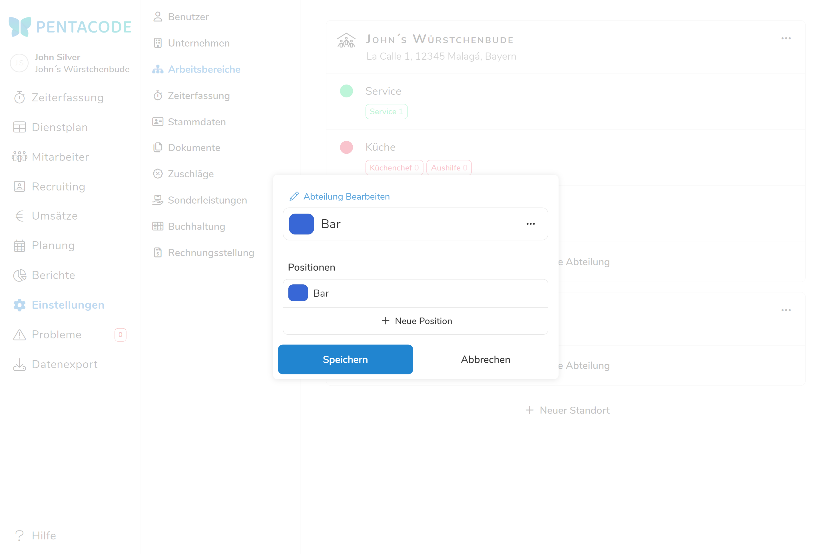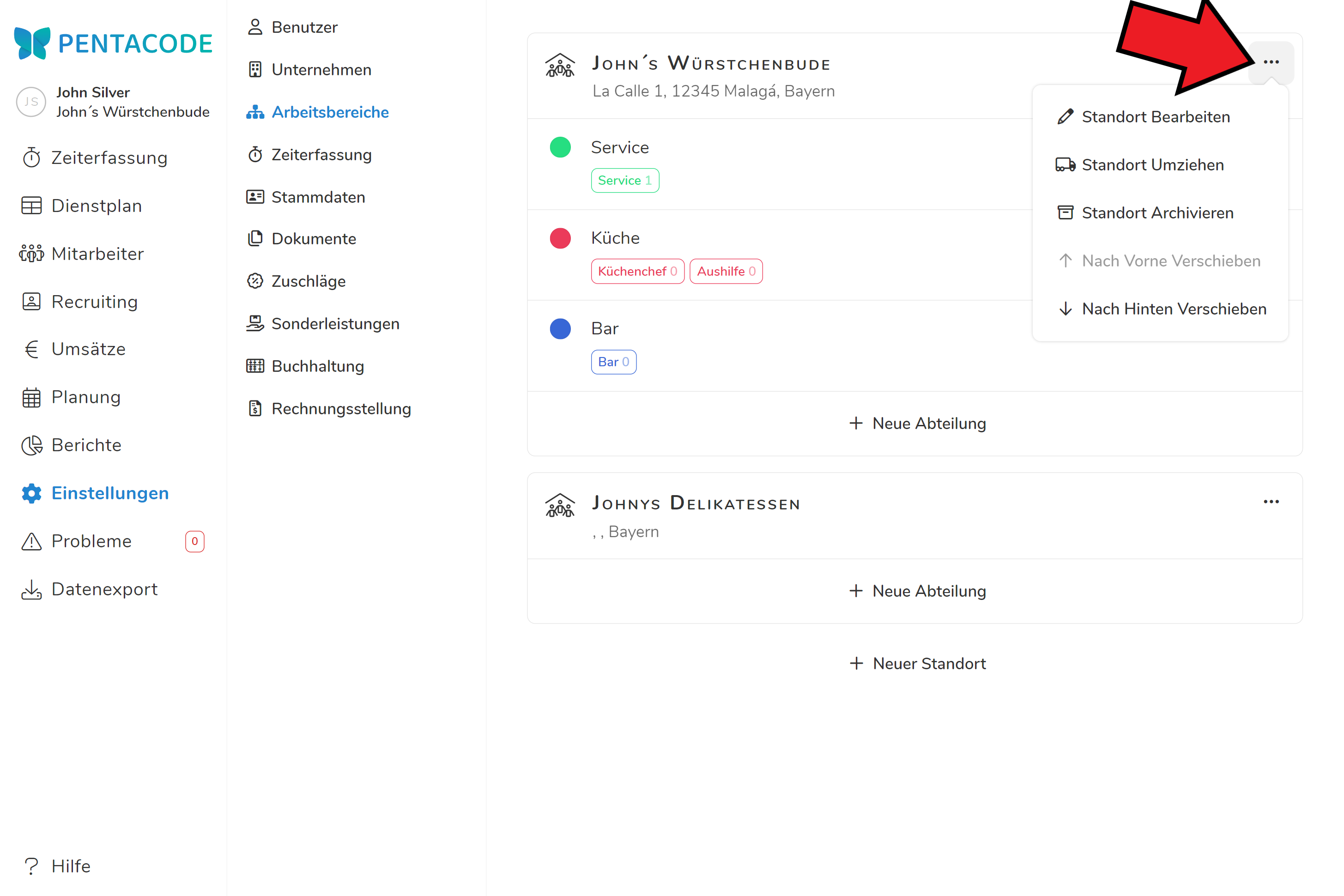 Im Menüpunkt "Arbeitsbereiche" legen Sie Standorte und deren Abteilungen an und können diese bearbeiten.