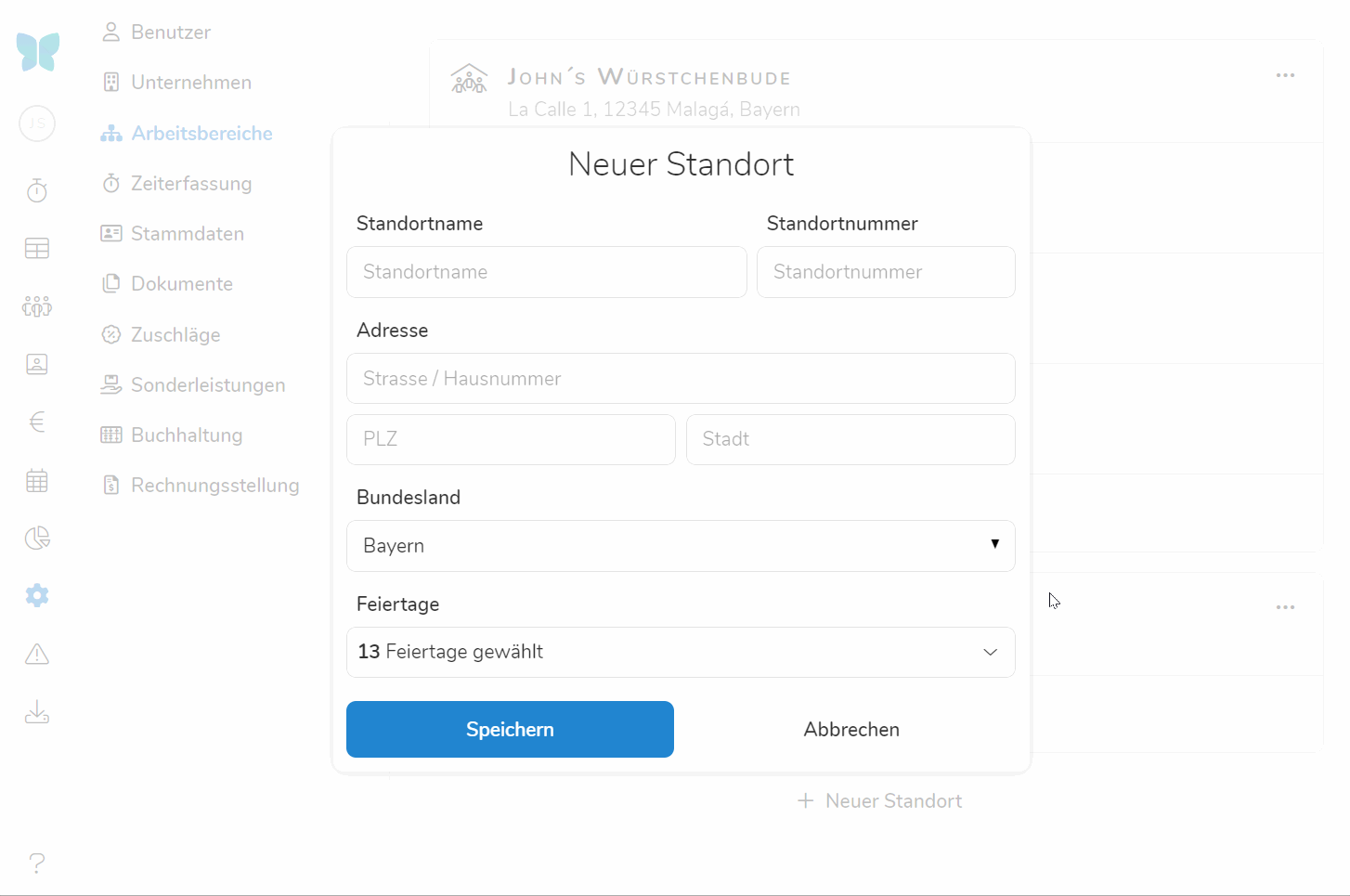 Wenn Sie einen neuen Standort anlegen oder bearbeiten, werden die Feiertage vorerst standardmäßig für das ausgewählte Bundesland festgelegt. Sollten Sie die Feiertage jedoch ändern wollen, können Sie diese ganz einfach über das Dialogfenster beim Bearbeiten des Standorts tun. Klicken Sie dazu auf den Schieberegler, bis dieser bei nicht gewünschten Feiertagen weiß erscheint und bei gewünschten Feiertage blau.