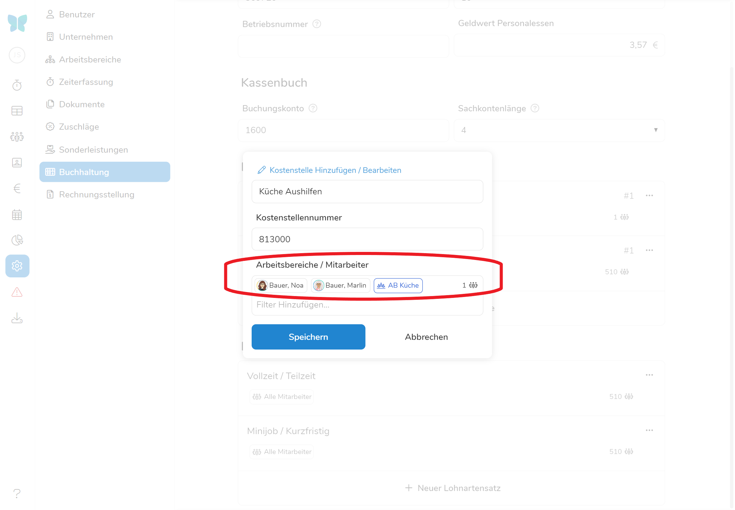 - Arbeitsbereiche / Mitarbeiter: Wählen Sie hier aus, welche Mitarbeiter unter der Kostenstelle berechnet werden sollen. Wählen Sie eine Abteilung in Kombination mit einzelnen Mitarbeitern aus, werden nur die Schichten des Mitarbeiters in der ausgewählten Abteilung dieser Kostenstelle angerechnet.
