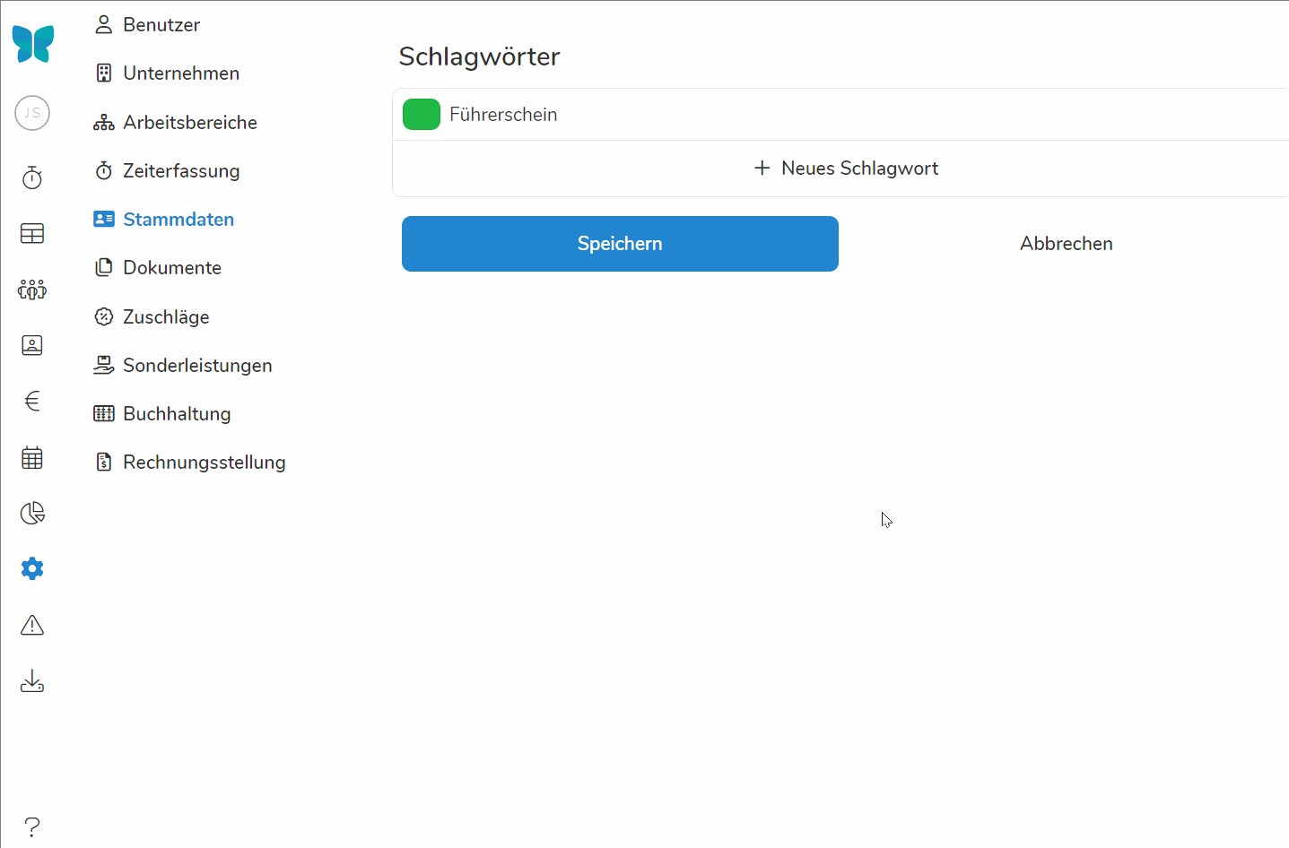 Schlagwörter stellen Eigenschaften und Gruppenzugehörigkeiten von Mitarbeitern dar und können diesen unter Mitarbeiter>Stammdaten zugeordnet werden. Später können wir dann im Dienstplan und der Mitarbeiterübersicht nach diesen Schlagwörtern filtern und sortieren.