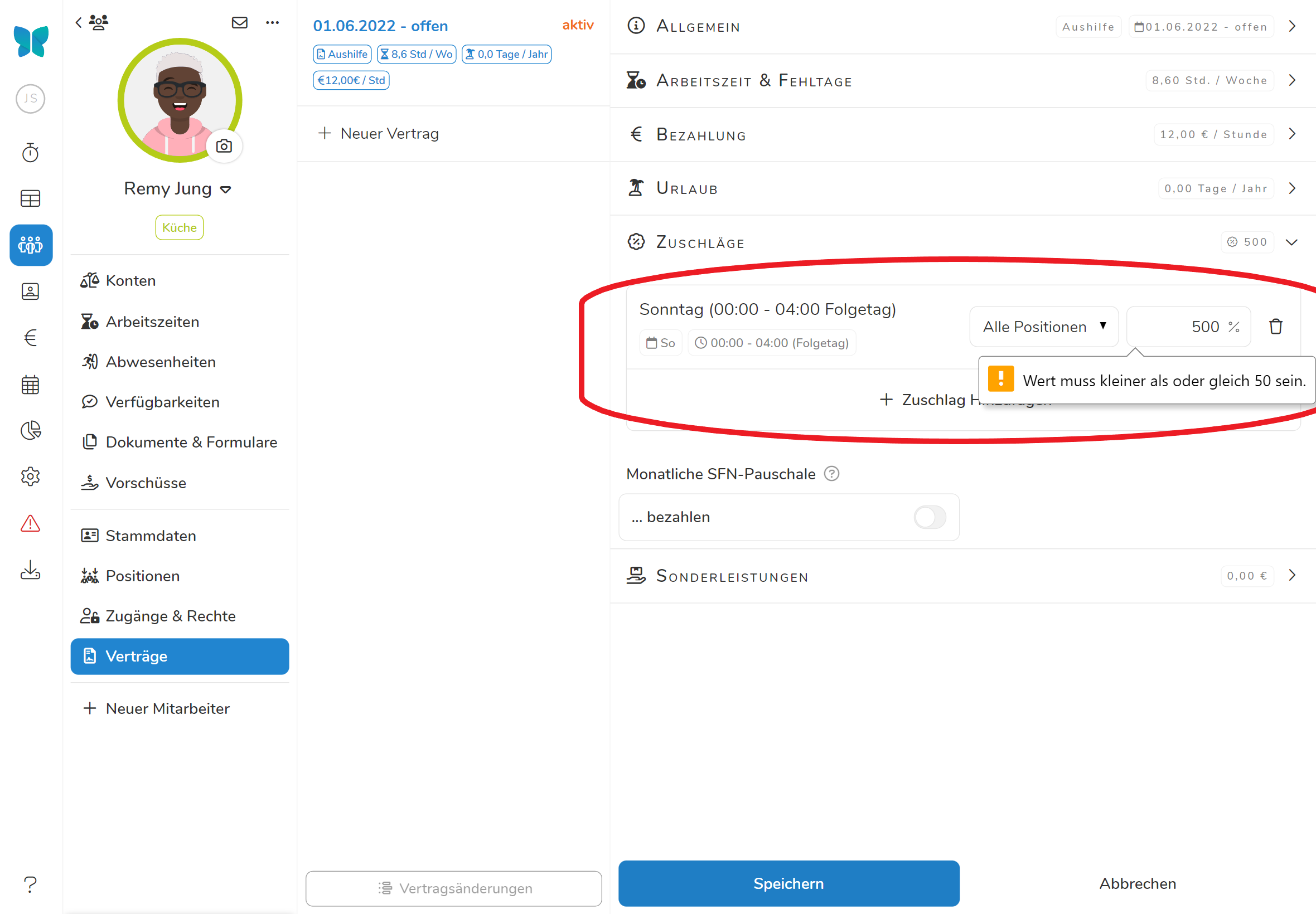 Um die nun erstellten Zuschläge Mitarbeitern zuzuordnen, wählen Sie den Reiter Mitarbeiter aus und navigieren Sie zu den Verträgen. Unter Zuschläge können Sie nun die Zuschläge auswählen, die dem Mitarbeiter angerechnet werden sollen. Weitere Informationen zur Zuteilung finden Sie unter Vertrag.