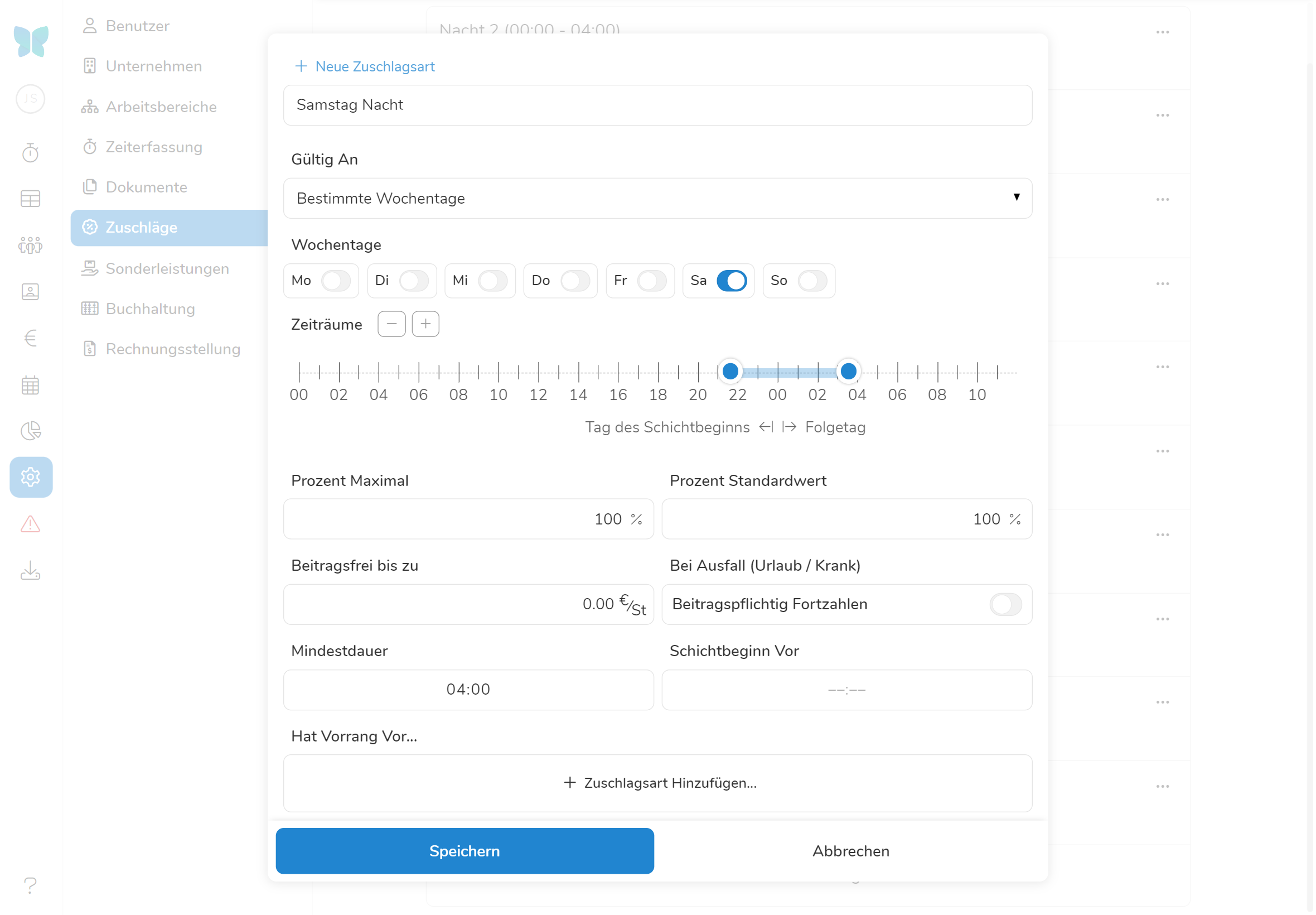 Wenn Sie weitere Zuschläge außerhalb der SFN-Zeiträume erstellen wollen, gehen sie folgend vor: