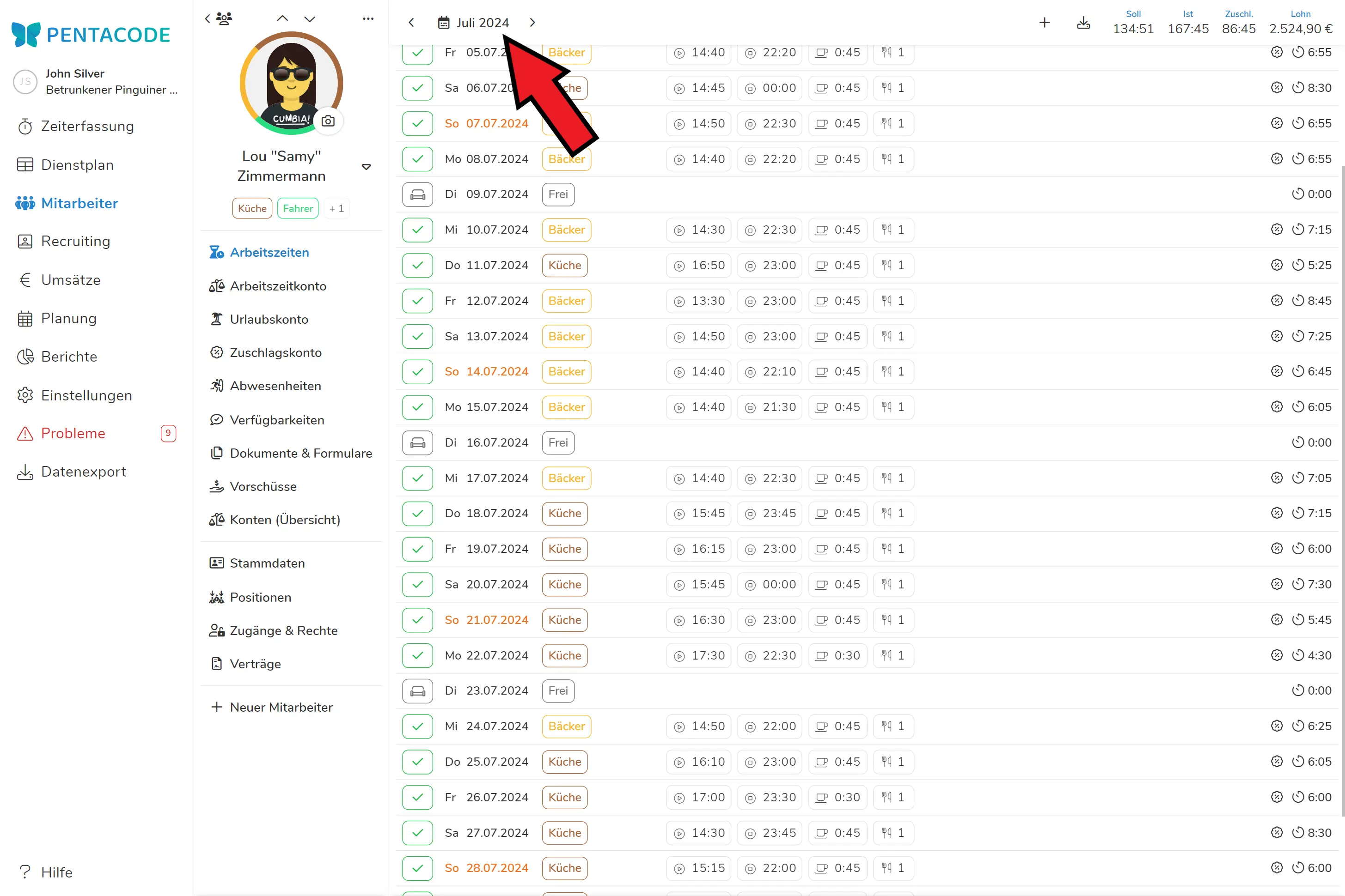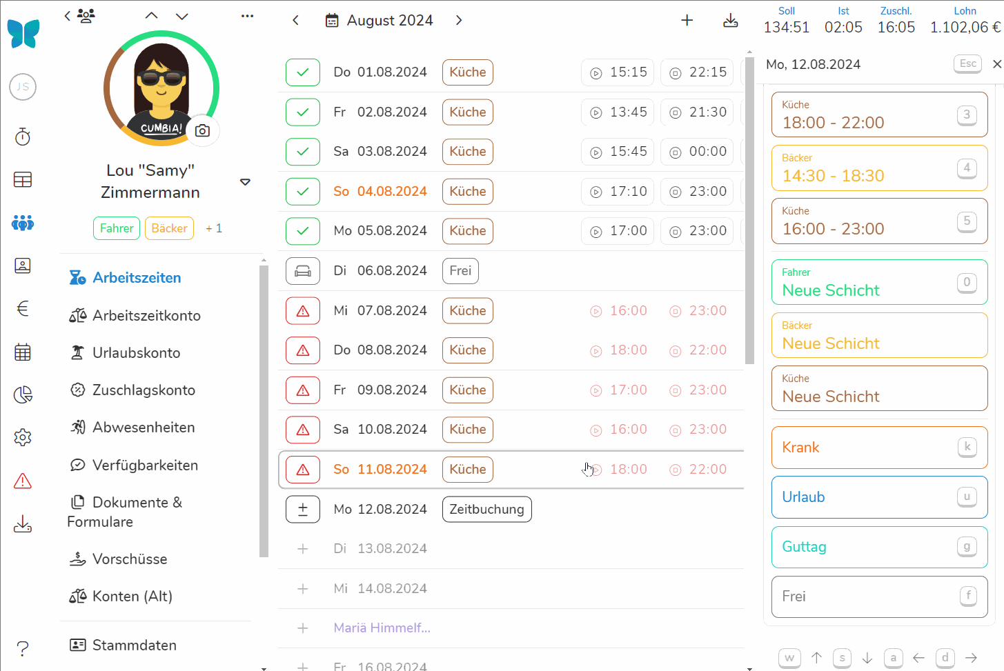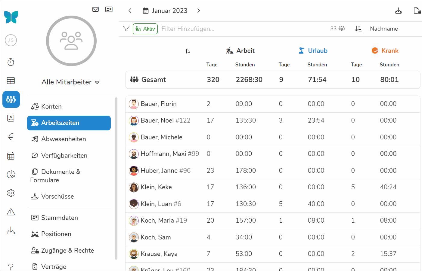 Das Arbeitszeitblatt zeigt Ihnen die geplanten und geleisteten Arbeitszeiten eines Mitarbeiters in einer übersichtlichen Liste an. Hier können Sie Arbeitszeiten erfassen, Abwesenheiten bearbeiten, Soll- und Ist-Stunden vergleichen und vieles mehr. Um zum Arbeitszeitblatt eines Mitarbeiters zu gelangen, navigieren Sie zunächst zur Arbeitszeiten-Übersicht und wählen dort den gewünschten Mitarbeiter.