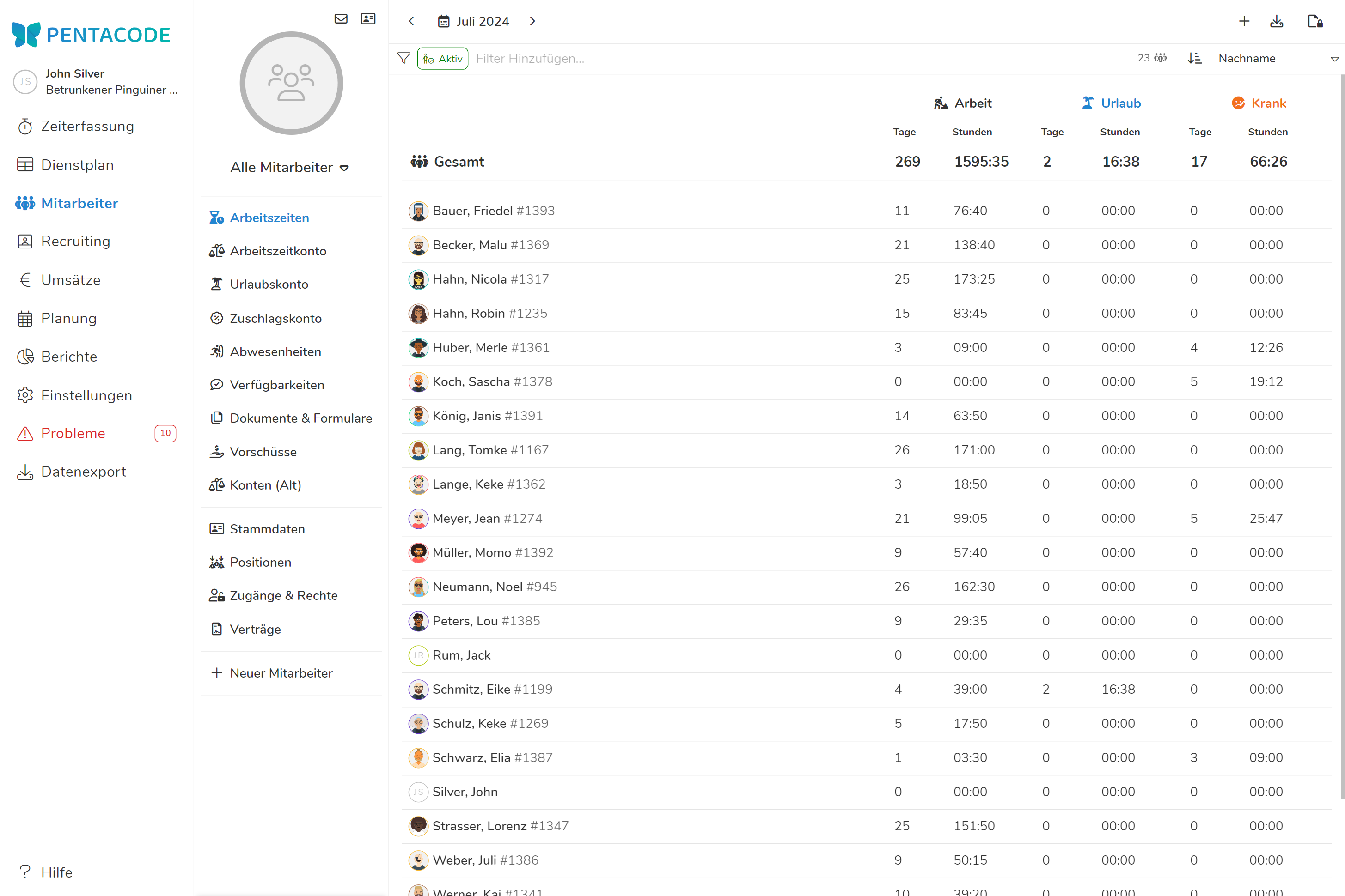 Das Planen, Erfassen und Dokumentieren von Arbeitszeiten gehört zu den Kernaufgaben von Pentacode. In diesem Artikel erfahren Sie unter anderem, wie Sie die Arbeitszeiten Ihrer Mitarbeiter einsehen, manuell erfassen, bearbeiten und exportieren können.