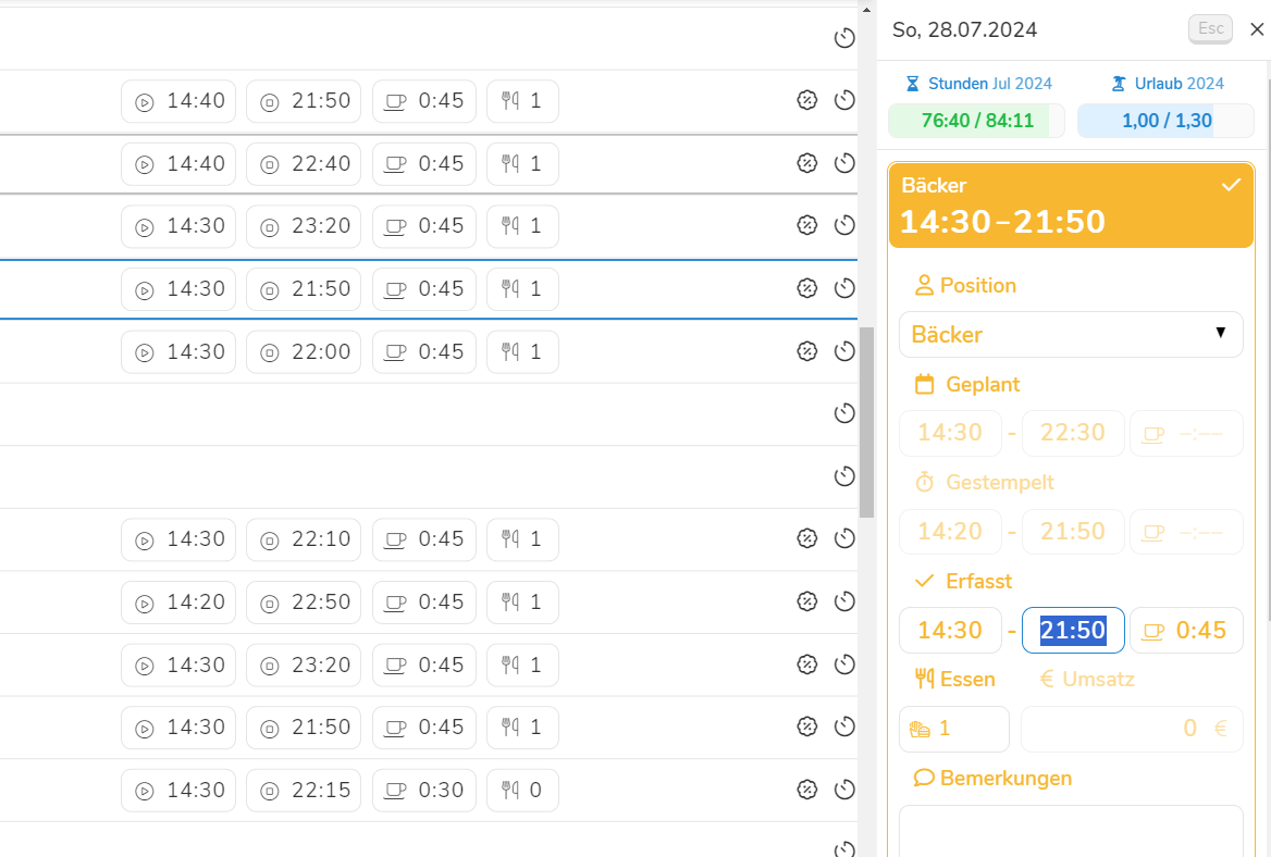 Tipp: Um beim Selektieren eines Eintrags direkt in ein bestimmtes Feld zu springen, klicken Sie einfach auf den entsprechenden Wert in der Listenansicht. Also wenn Sie z.B. die Pausenzeit bearbeiten wollen, klicken Sie einfach auf den Pausenwert und Sie landen direkt im entsprechenden Eingabefeld wo Sie Ihre Änderung vornehmen können.