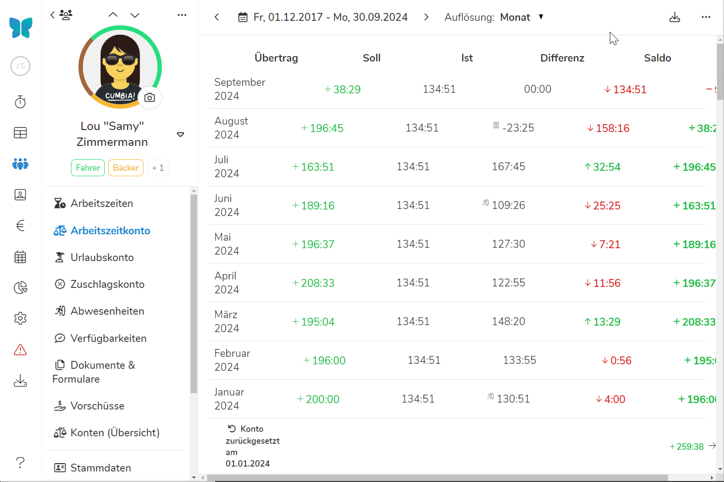 Unter Konten (Übersicht) wird das Arbeitszeitkonto gemeinsam mit dem Zuschlagskonto und Urlaubskonto in einer gemeinsamen Übersicht zusammengefasst.