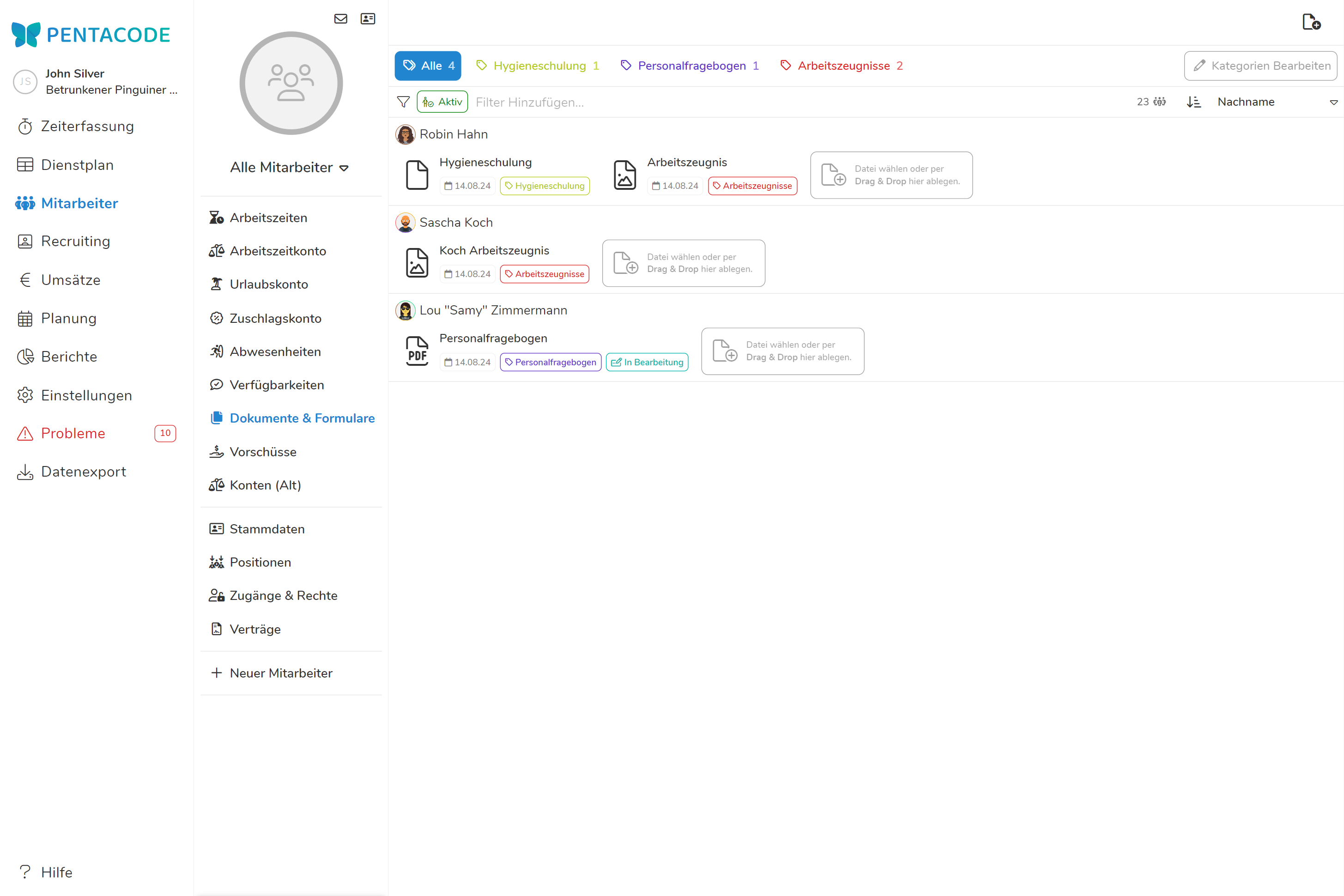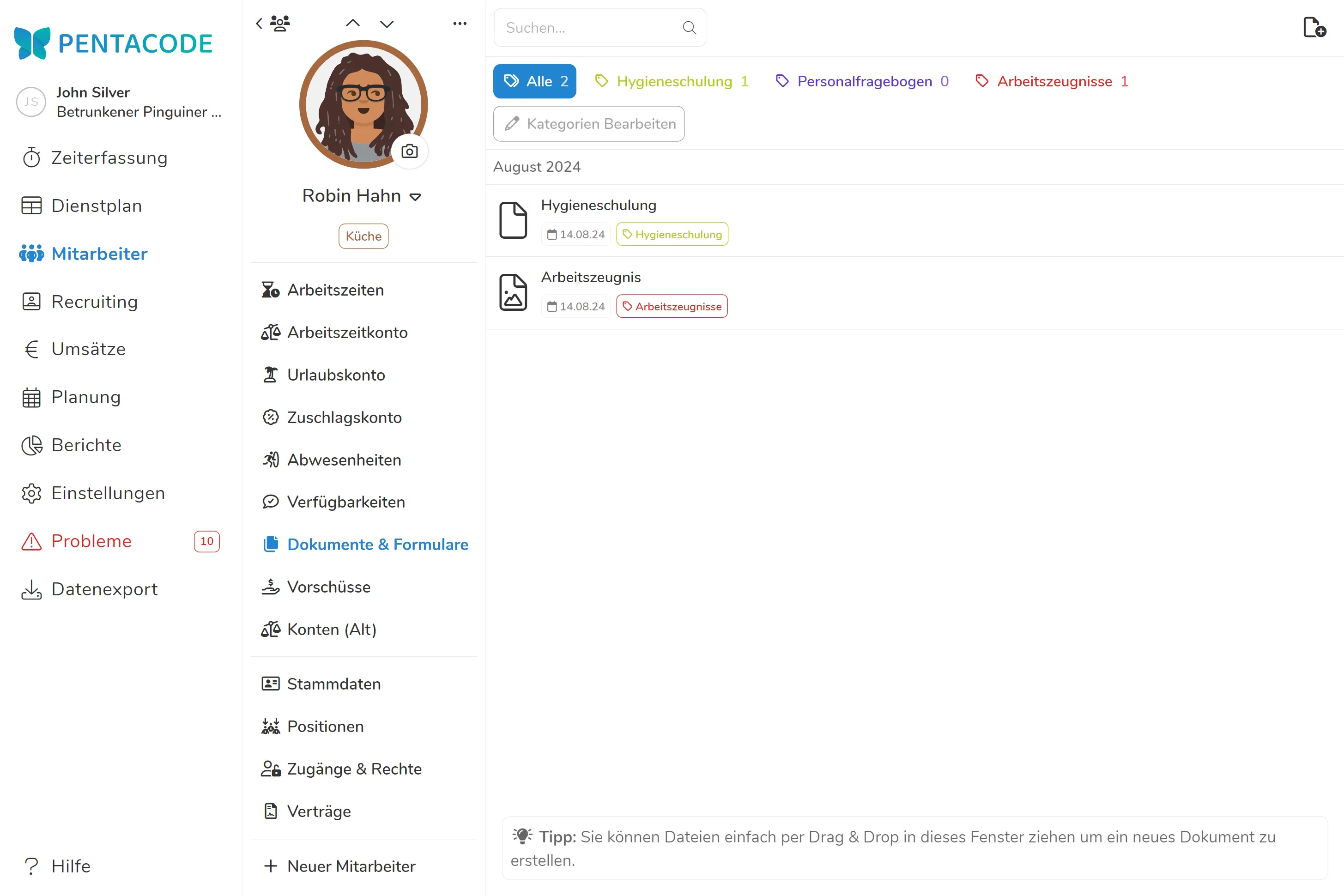 In die Dokumentenübersicht gelangen Sie über den Reiter Mitarbeiter im Hauptmenü und den Unterpunkt Digitale Personalakte. Die Dokumentenübersicht zeigt Ihnen eine sortierte Liste ihrer gespeicherten Dokumente. Unter jedem Mitarbeiter erscheinen dabei die ihm zugeteilten Dateien mit Namen, Datum und Kategorien. Von hier aus können Sie Dateien einsehen, indem Sie auf das gewünschte Dokument klicken, worauf sich diese in ihrem Browserfenster öffnet. Sie können zudem neue Dateien hinzufügen oder nach bestimmten Mitarbeitern und Kategorien filtern.