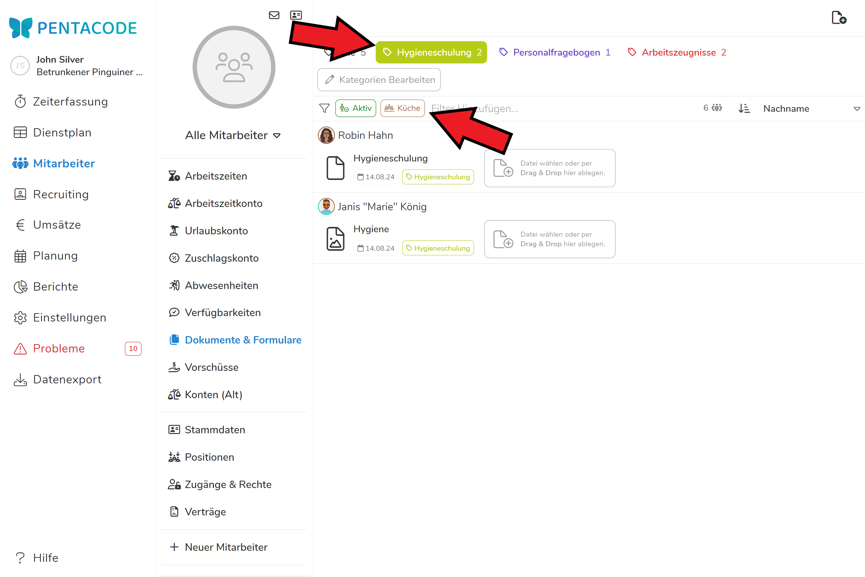 Beispiel: Sollte eine Behörde alle Hygieneschulungen ihrer Köche einsehen wollen, stellen Sie den Filter auf Küche und die Kategorien auf Hygieneschulung und schon haben Sie alle relevanten Bescheinigungen aufgelistet.
