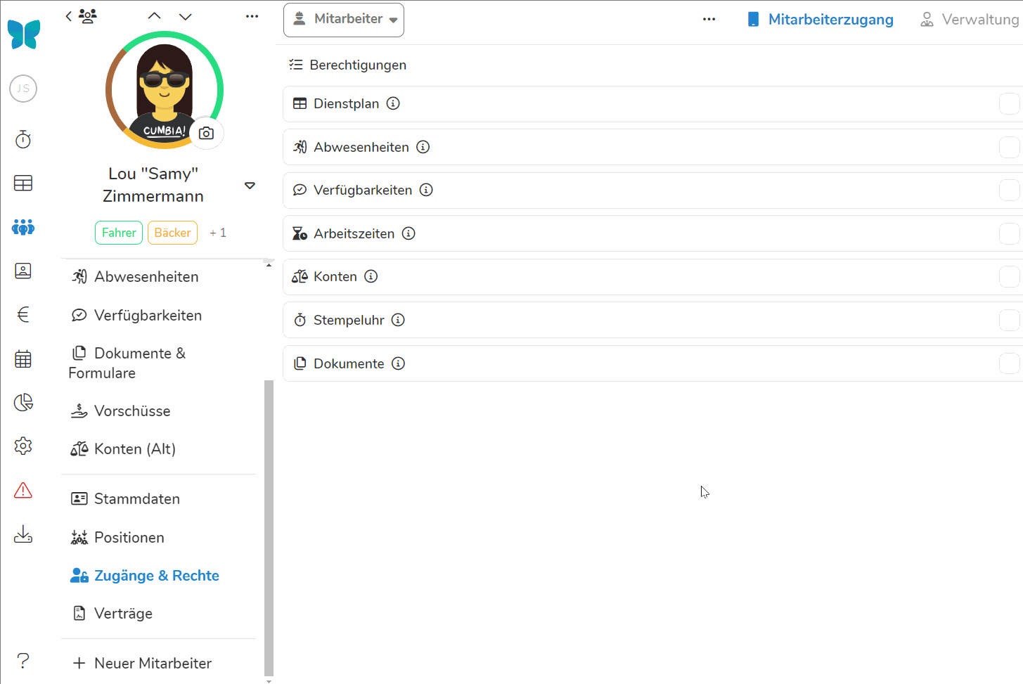 In vielen Fällen macht es Sinn ihren Mitarbeitern Zugriff auf ihre eigenen Dokumente zu gewähren. So haben sie die Möglichkeit diese einzusehen - nicht aber die Dokumente anderer Mitarbeiter. Gehen Sie dazu unter Mitarbeiter auf Zugänge und Rechte und kreuzen Sie das Kästchen Dokumente unter Mitarbeiterzugang an. Von nun an kann die ausgewählte Person in ihrer Mitarbeiterapp die für sie gespeicherten Dokumente einsehen aber keine weiteren hinzufügen oder bestehende löschen.