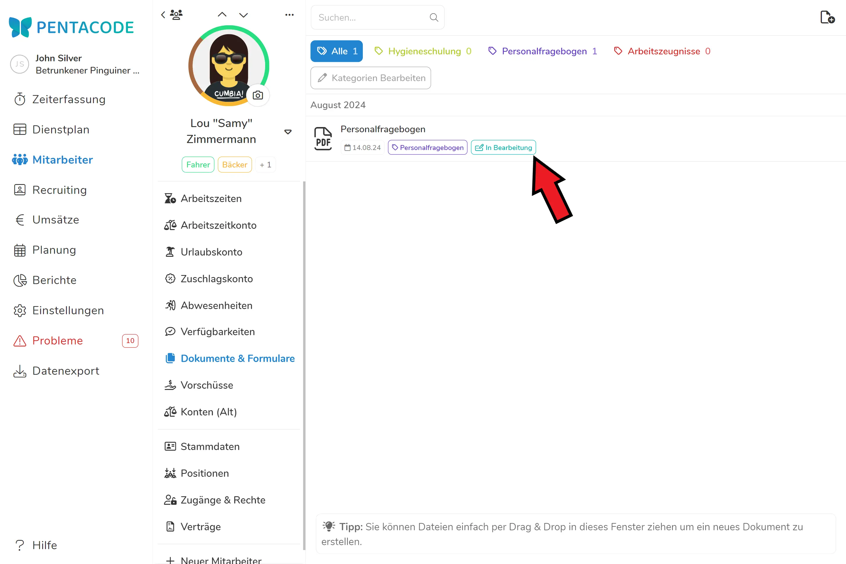 Jedes Dokument ist einem bestimmten Mitarbeiter zugeordnet. Diese Zuordnung kann jederzeit durch einen Klick auf das Feld Mitarbeiter geändert werden.