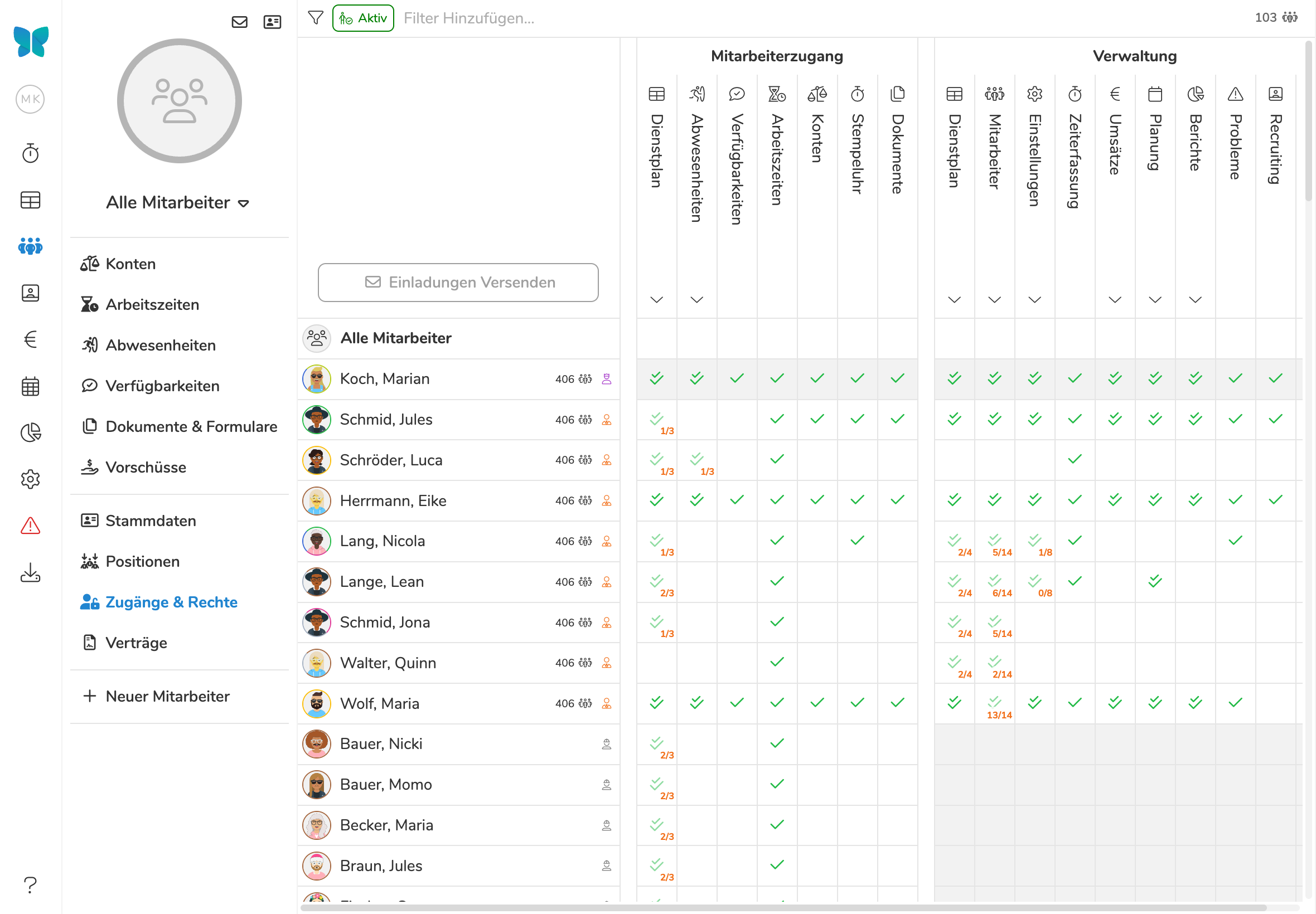 In der Zugänge & Rechte Übersicht sehen Sie auf einen Blick, wer auf welche Bereiche der Software Zugriff hat und können schnell und bequem Anpassungen vornehmen.