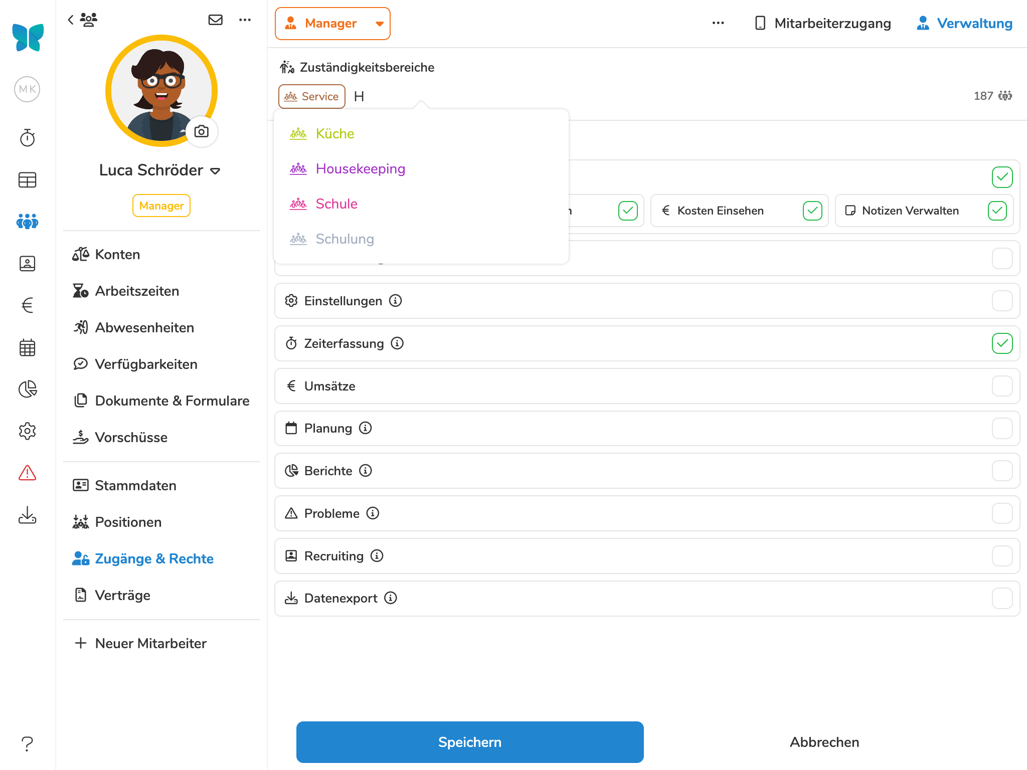 - Wählen Sie den Punkt Mitarbeiter aus dem Hauptmenü und dort den Unterpunkt Zugänge & Rechte.
