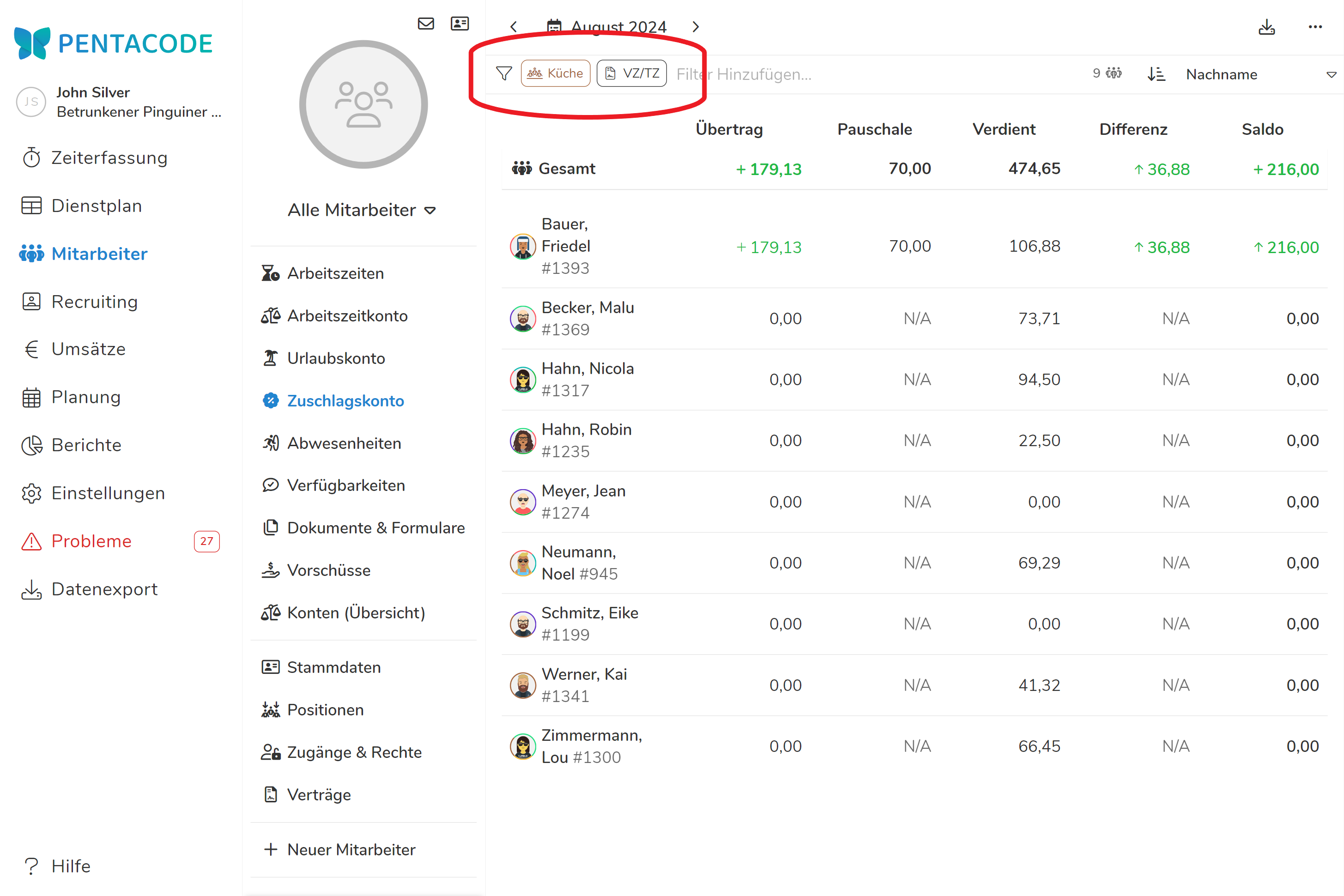 Wie in anderen Übersichten können Sie auch im Zuschlagskonto nach Positionen, Beschäftigungsverhältnis und einzelnen Mitarbeitern filtern. Klicken Sie dazu einfach auf die Leiste mit dem Symbol und wählen aus der Liste die gewünschten Kategorien aus.