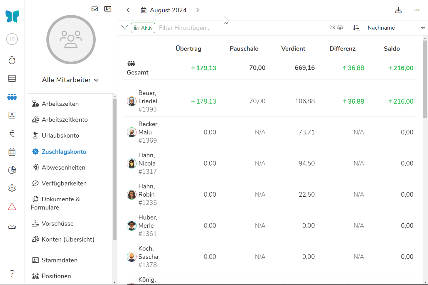 In der Übersicht sehen Sie die SFN-Zuschläge ihrer Mitarbeiter standardmäßig für den aktuellen Monat. Sie können jedoch auch jeden beliebigen Zeitraum auswählen.