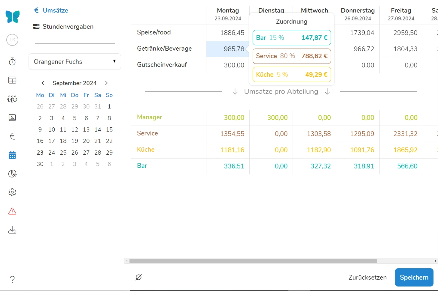 Mit den Schiebereglern über den Wochentagen können Sie ihre Umsatzerwartung prozentual anpassen. Bei dieser Vorgehensweise werden mit dem Gesamtumsatz sowohl die einzelnen Umsatzarten, als auch die Umsätze der einzelnen Abteilungen im gleichbleibenden Verhältnis zueinander linear erhöht oder herabgesetzt.