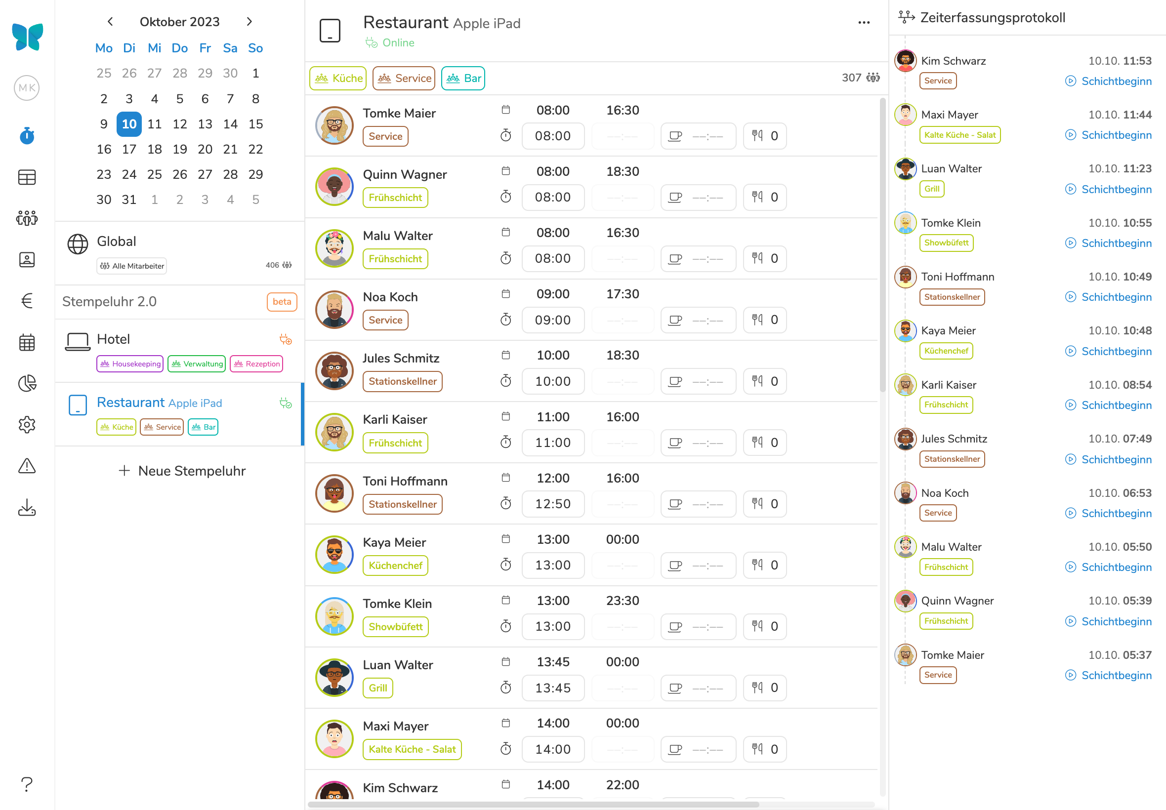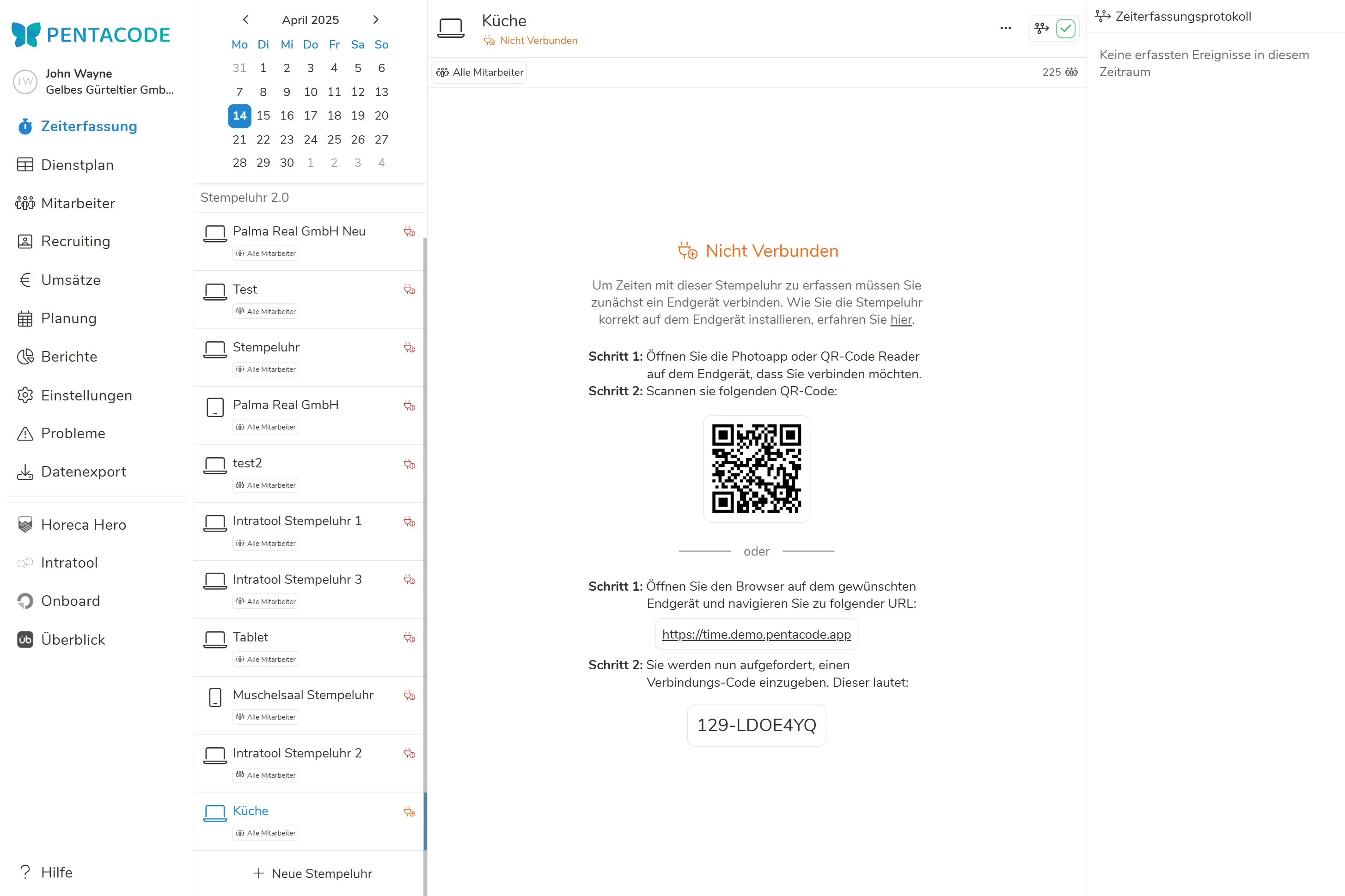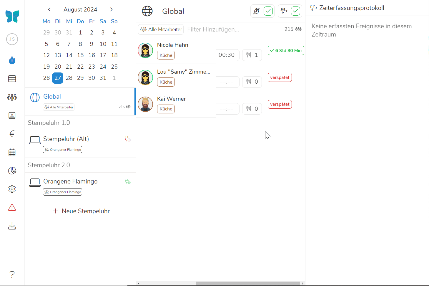 Unter dem Hauptmenüpunkt finden Sie das Zeiterfassungs-Dashboard. Hier haben Sie immer einen Überblick über alle geplanten und erfassten Arbeitszeiten. Außerdem können Sie hier Stempeluhren einrichten und verwalten, deren Verbindungsstatus überwachen und das Zeiterfassungs-Ereignisprotokoll einsehen.