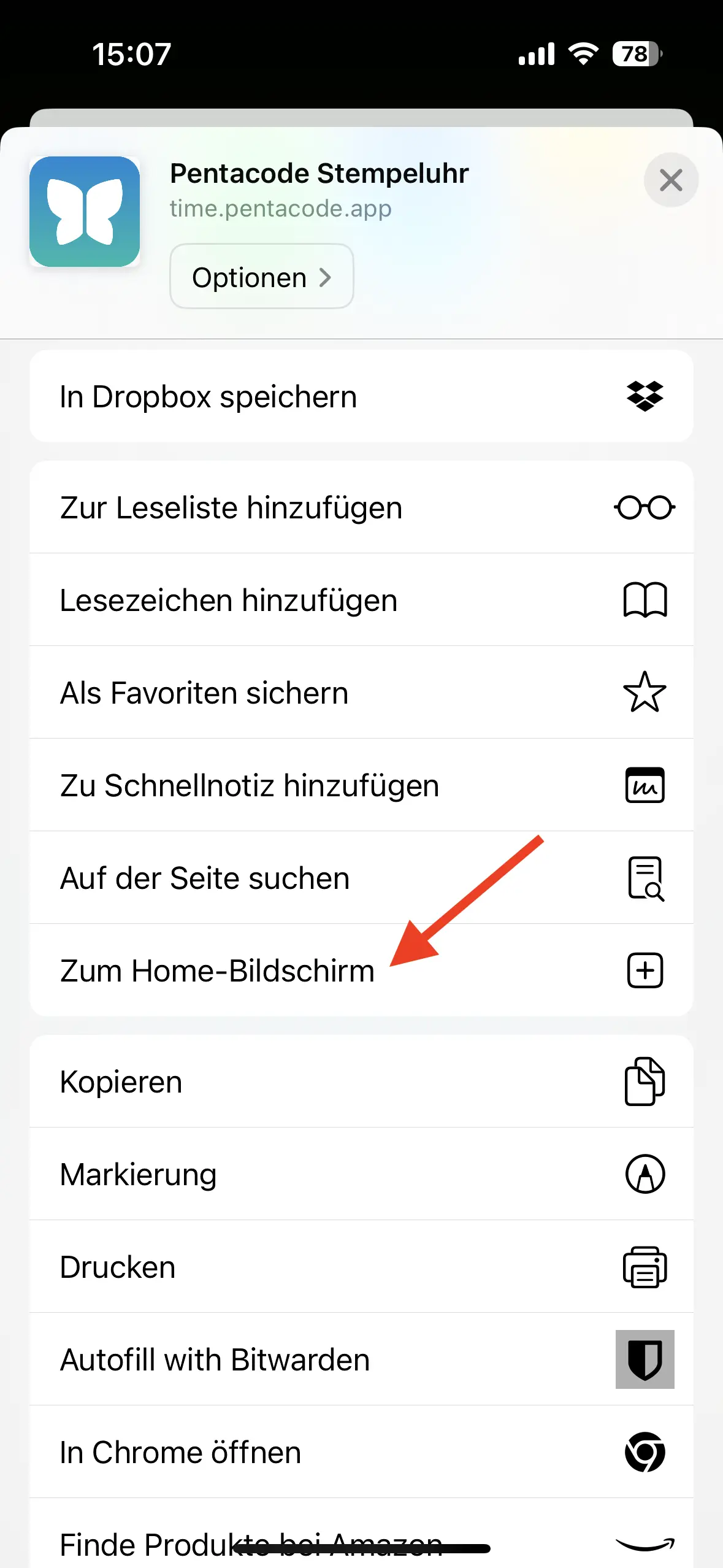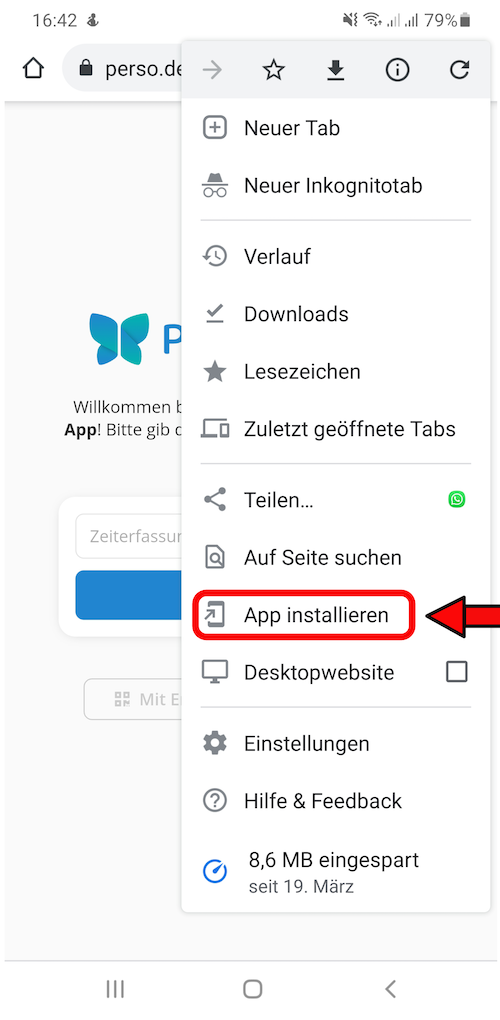 Die Pentacode Stempeluhr ist eine Webapplikation und erfordert keine Installation im herkömmlichen Sinne. Sowohl iOS als auch Android bieten allerdings die Möglichkeit, Webapplikationen von dieser Art "zum Homebildschirm hinzuzufügen". Dies fügt die App nicht nur zur Bibliothek auf Ihrem Handy hinzu, wo sie sie wie eine normale App öffnen können - die App wird dann auch in Ihren eigenen Fenster angezeigt und ist somit in Erscheinung und Funktion identisch mit einer "normalen" App.