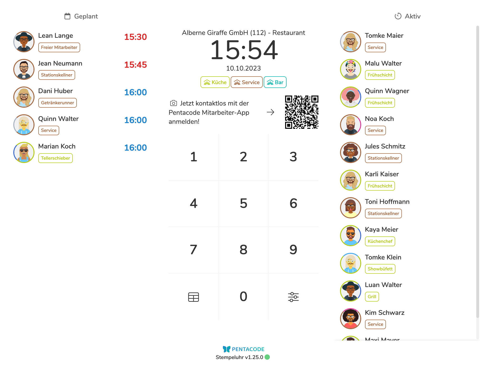 Abhängig von der auf dem Endgerät verfügbaren Bildschirmgröße werden neben dem Zahlenpad außerdem geplante und aktive Schichten angezeigt. Diese können allerdings über die Anzeigeoptionen ausgeblendet werden.